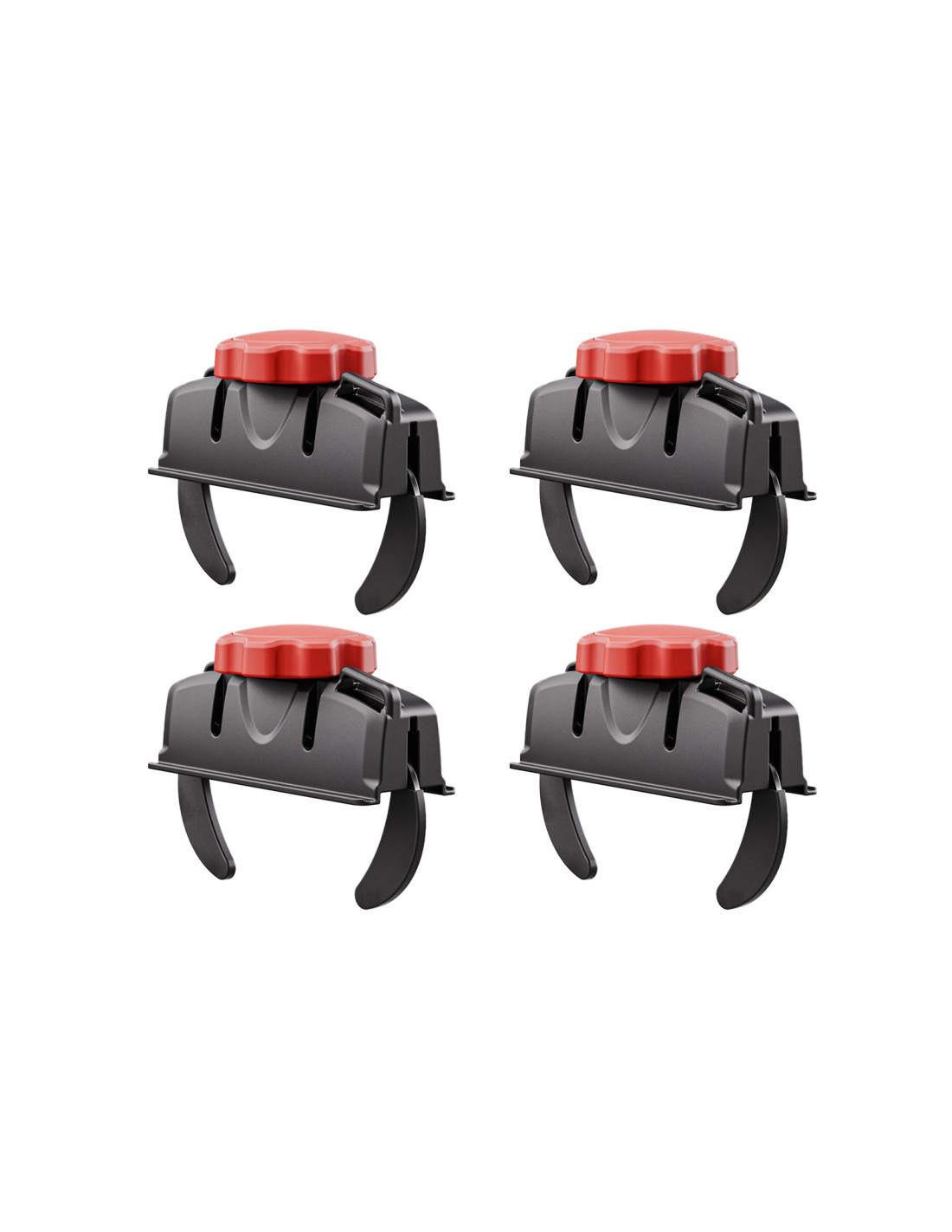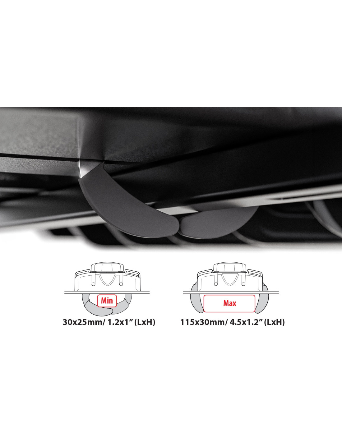 Kit de montaje externo diseñado para ofrecer una fijación rápida, estable y universal a las barras de techo. El práctico pomo superior permite que las garras se cierren automáticamente y se adapten al perfil de la barra, garantizando una sujeción segura y fiable sin necesidad de herramientas. Compatible con una amplia variedad de barras de techo gracias a su sistema ajustable, soporta dimensiones: