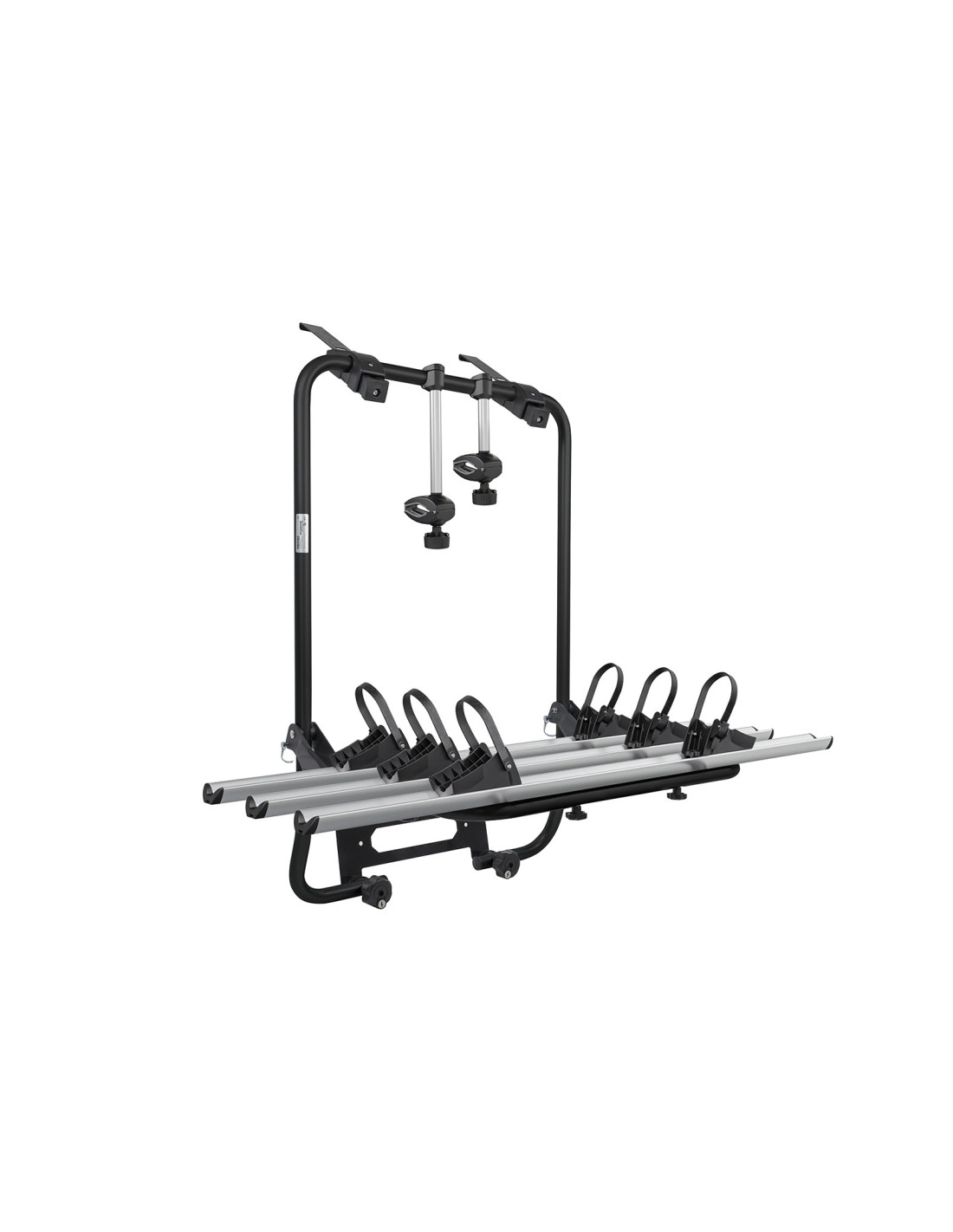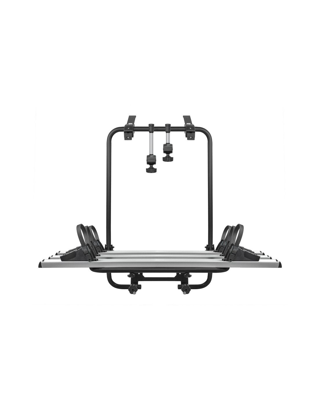 Portabicicletas trasero exclusivo para Volkswagen California (T6) 16>, Caravelle (T6) 15> y Transporter/Multivan (T6) 15>. Fabricado en acero y equipado con un canal de aluminio, es capaz de transportar hasta 3 bicicletas con una capacidad máxima de 45kg, incluidas E-bikes y Fat bikes. Sistema de fijación sin correas mediante bandas de acero y pomos antirrobo para bicicletas y portabicicletas incluidos. Práctico, ligero y plegable sobre sí mismo para facilitar el transporte y el almacenamiento.