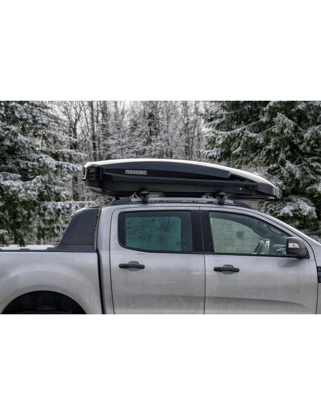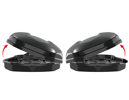 Coffre de toit noir brillant et aérodynamique, avec une capacité de 550lt, double ouverture et montage rapide qui s’adapte à l’extérieur des barres de toit