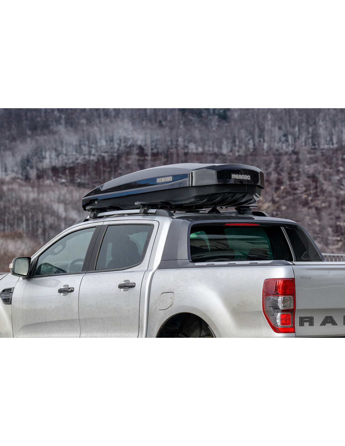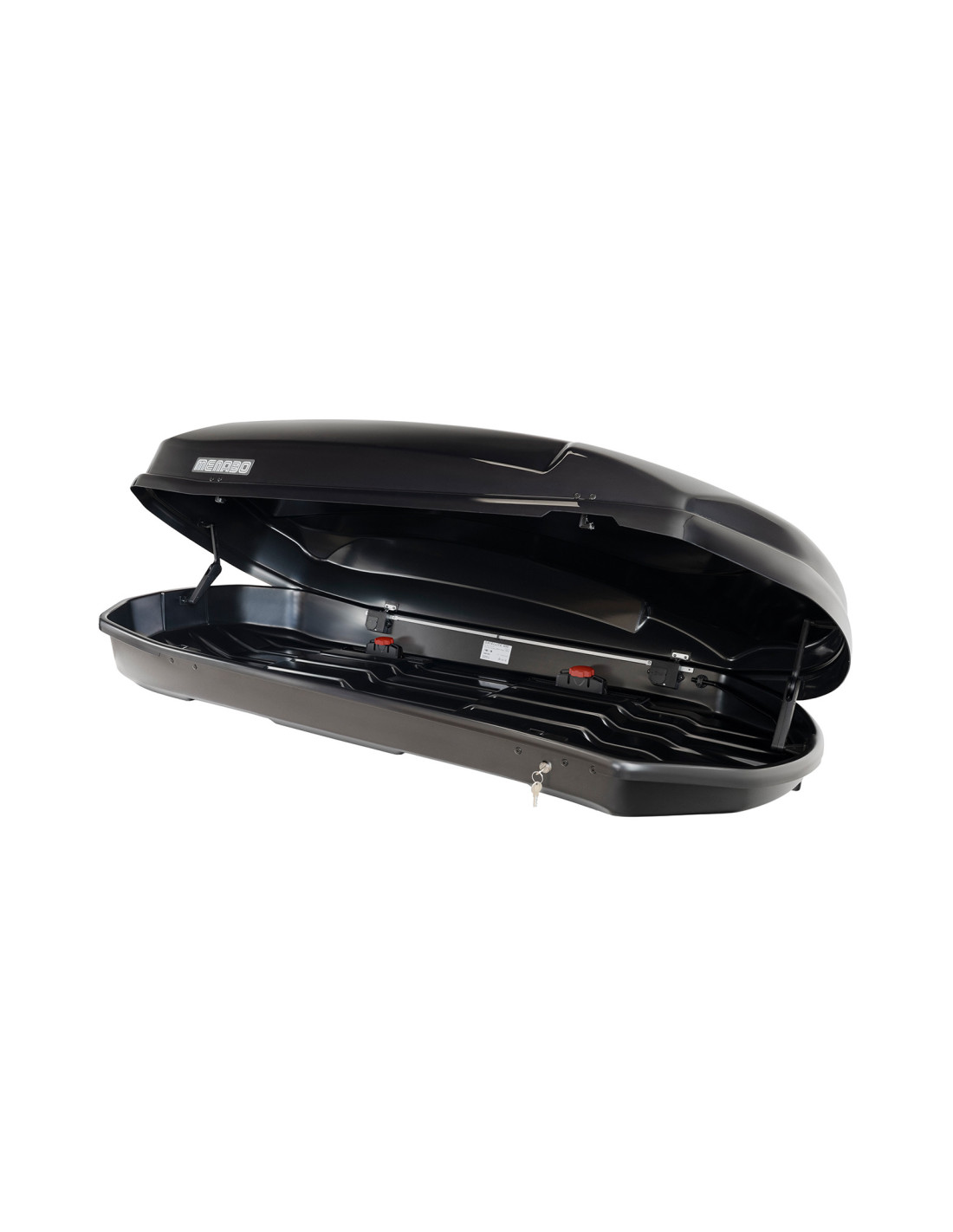Coffre de toit noir brillant et aérodynamique, avec une capacité de 600lt, double ouverture et montage rapide qui s’adapte à l’extérieur des barres de toit